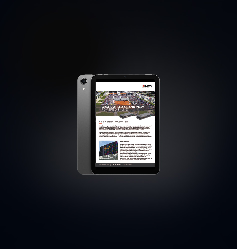 Um das Fan-Erlebnis zu verbessern, benötigte die Arena eine leistungsstarke Lösung, um zwei große LED-Wände zu betreiben und ein immersives Seherlebnis von jedem Platz aus zu gewährleisten. Gemeinsam mit der professionellen Konnektivitäts-Expertise von Lindy lieferte Stage Sound & Light ein System, das gestochen scharfe Bilder, synchronisierte Wiedergabe und zuverlässige Übertragung über lange Distanzen garantiert – unerlässlich für einen reibungslosen Betrieb in einem so prestigeträchtigen Sportstadion.