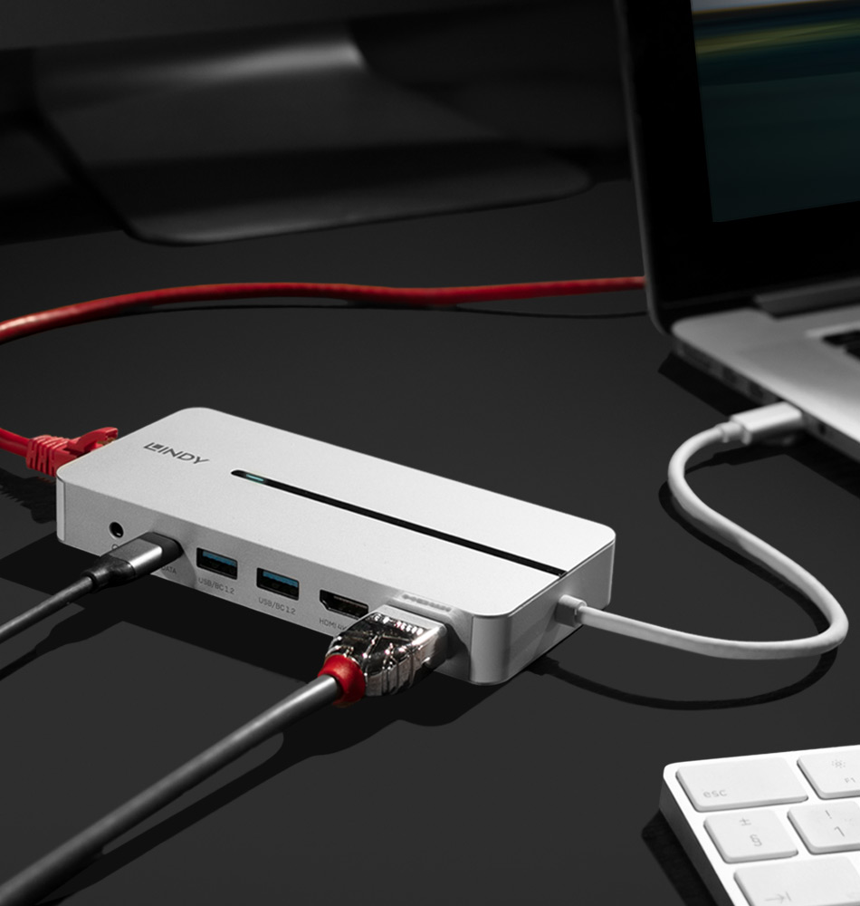 Lindy’s new range of laptop docking stations brings together the best of both worlds. A single USB Type C cable can be used to send multiple screen contents to multiple displays simultaneously and all USB peripherals can be used at the same time. The notebook can also be connected to the wired office network via Gigabit Ethernet and charged via Power Delivery. And after the work is done, the computer is ready for take-off by disconnecting a single connector.