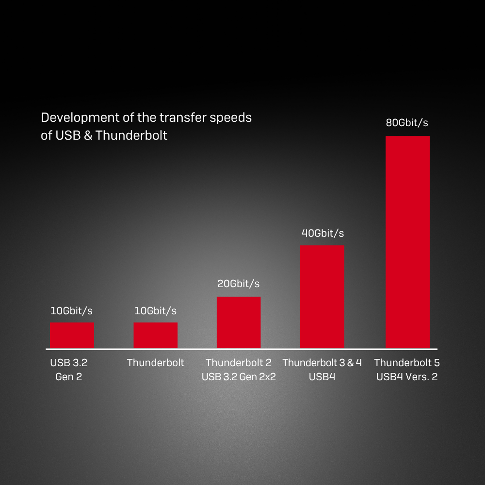 USB4 is the first standard to truly combine the strengths of both USB and Thunderbolt. Offering transfer speeds of up to 40 Gbit/s — twice as fast as USB 3.2 — it merges the flexibility of USB hubs with the high performance of Thunderbolt.