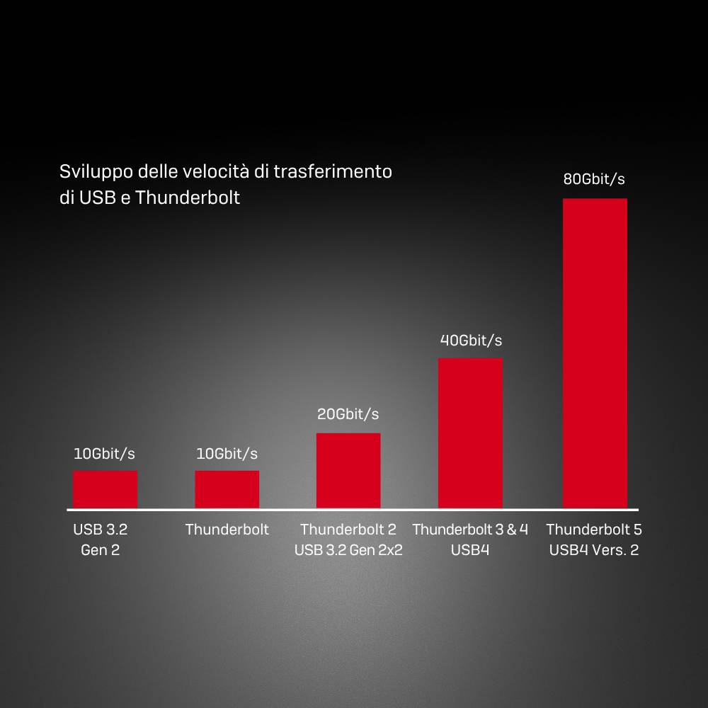 Thunderbolt è stato introdotto da Intel e Apple nel 2011. Basato su DisplayPort e utilizzando un canale dati PCIe bidirezionale, ha permesso di raggiungere velocità significativamente superiori. Thunderbolt 3 ha segnato il debutto del connettore USB-C. Inizialmente, con una velocità doppia rispetto all’USB 3.0, Thunderbolt ha rappresentato una seria sfida per l’USB.